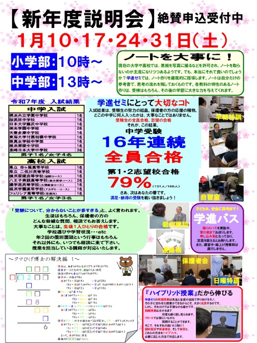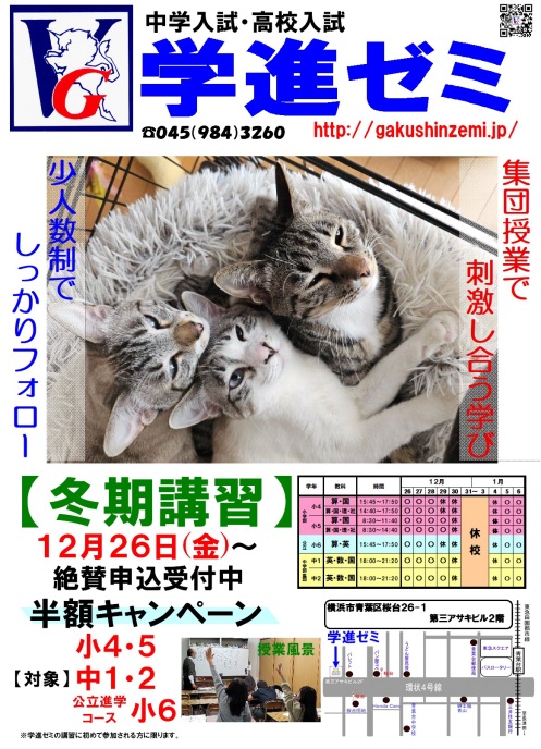 12月26日から始まります![]() 詳細は、こちらへ 講習費半額キャンペーン実施!! さらに、そのまま入会されると 入会金免除!! 対象学年 小学4年・小学5年 公立進学コース小学6年 中学1年・中学2年 テキストの準備などの都合のため、お早めにお申し込みください。 ※ただし、学進ゼミの講習に初めて参加される方に限らせて頂きます。 |